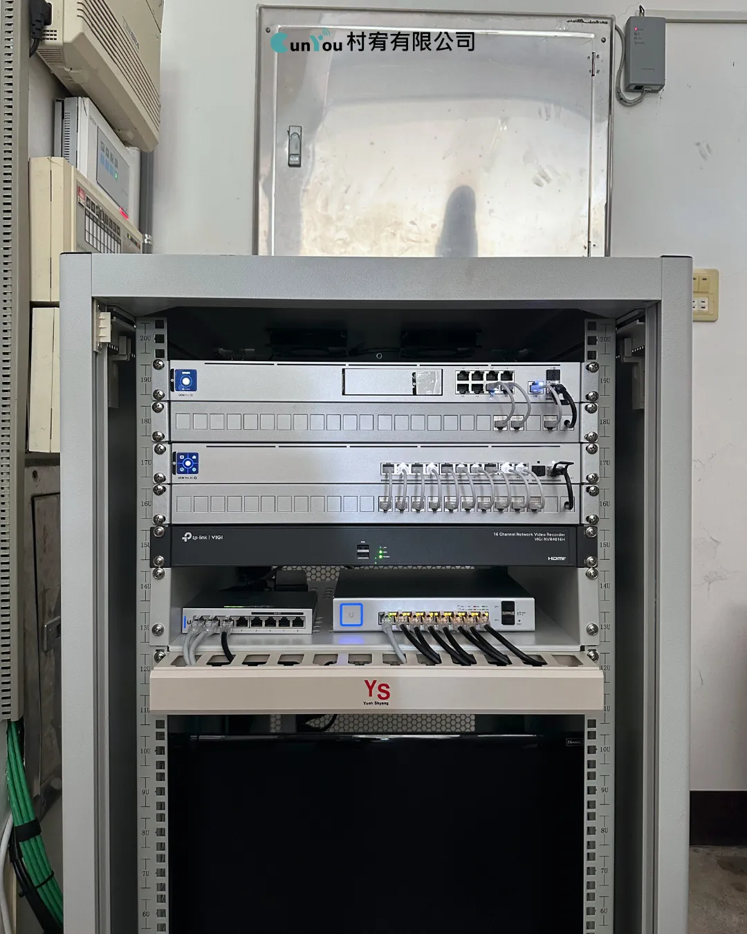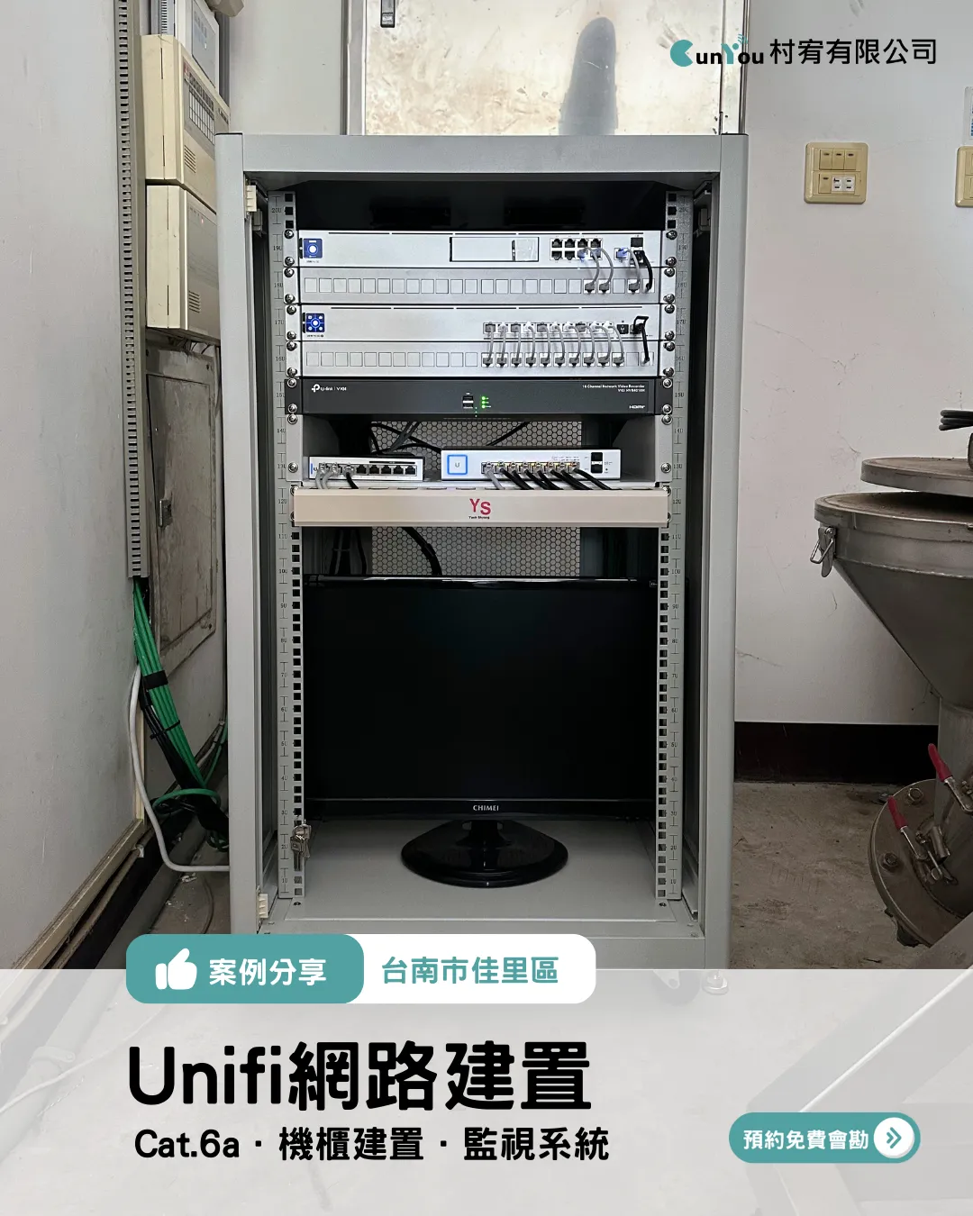 包含機櫃規劃、Cat.6a 網路佈線與設備整合,